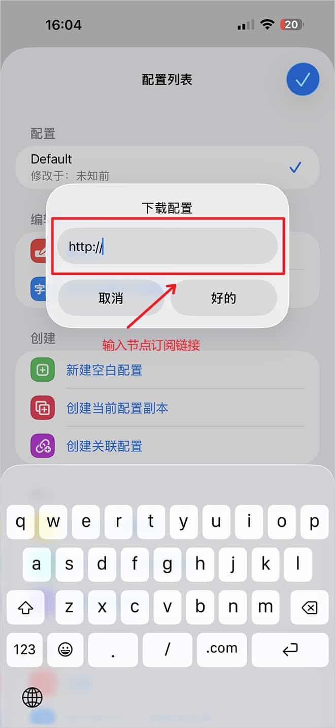 在弹出的窗口中输入配置链接即节点订阅链接即可,如下图所示: