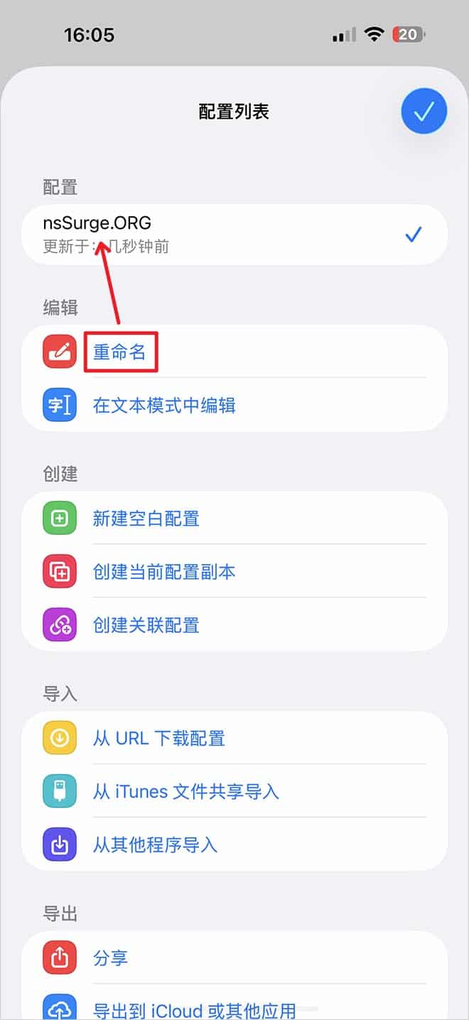 成功导入配置文件后如下图所示,可以重命名为好记的文件,如下图所示: