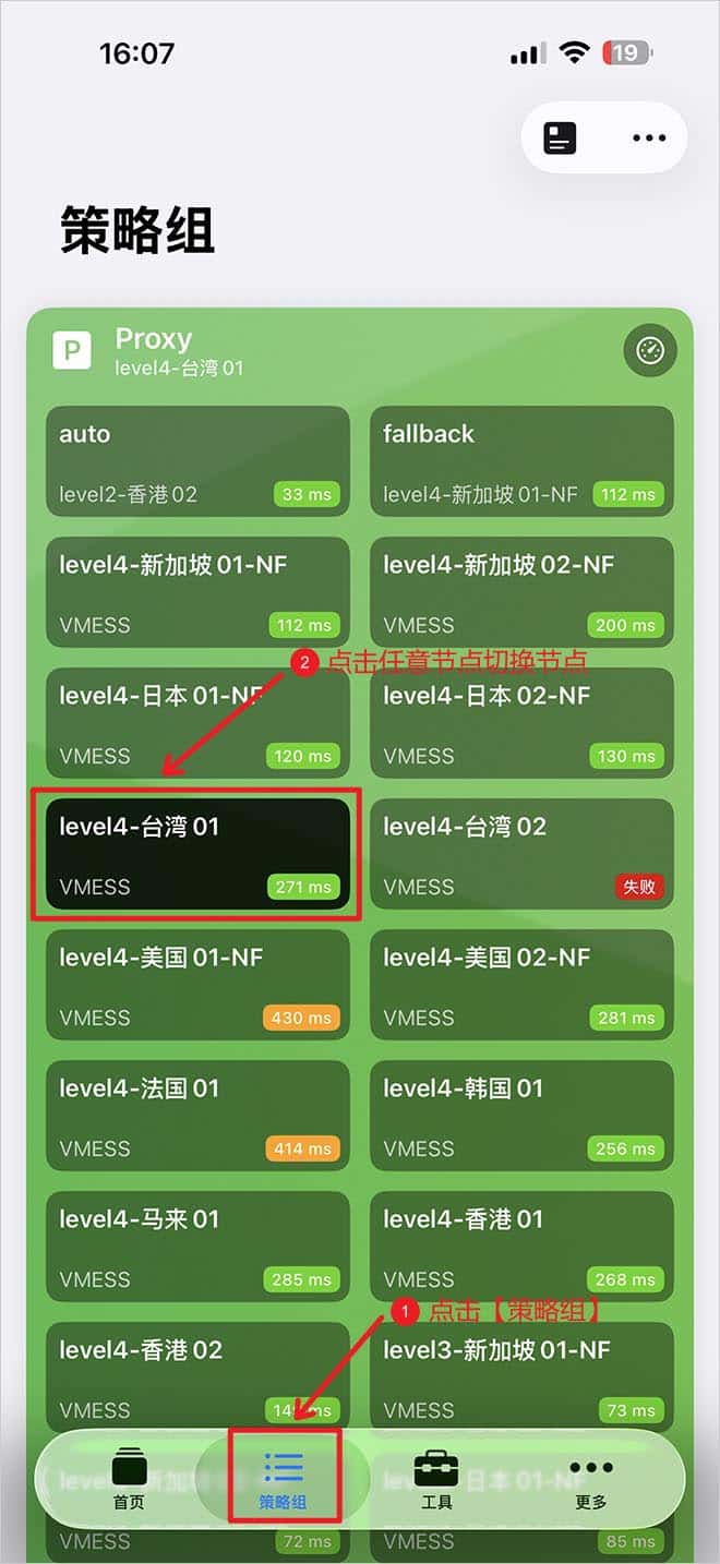 可以看到有很多节点,点击任意节点即可切换代理节点服务器,如下图所示: